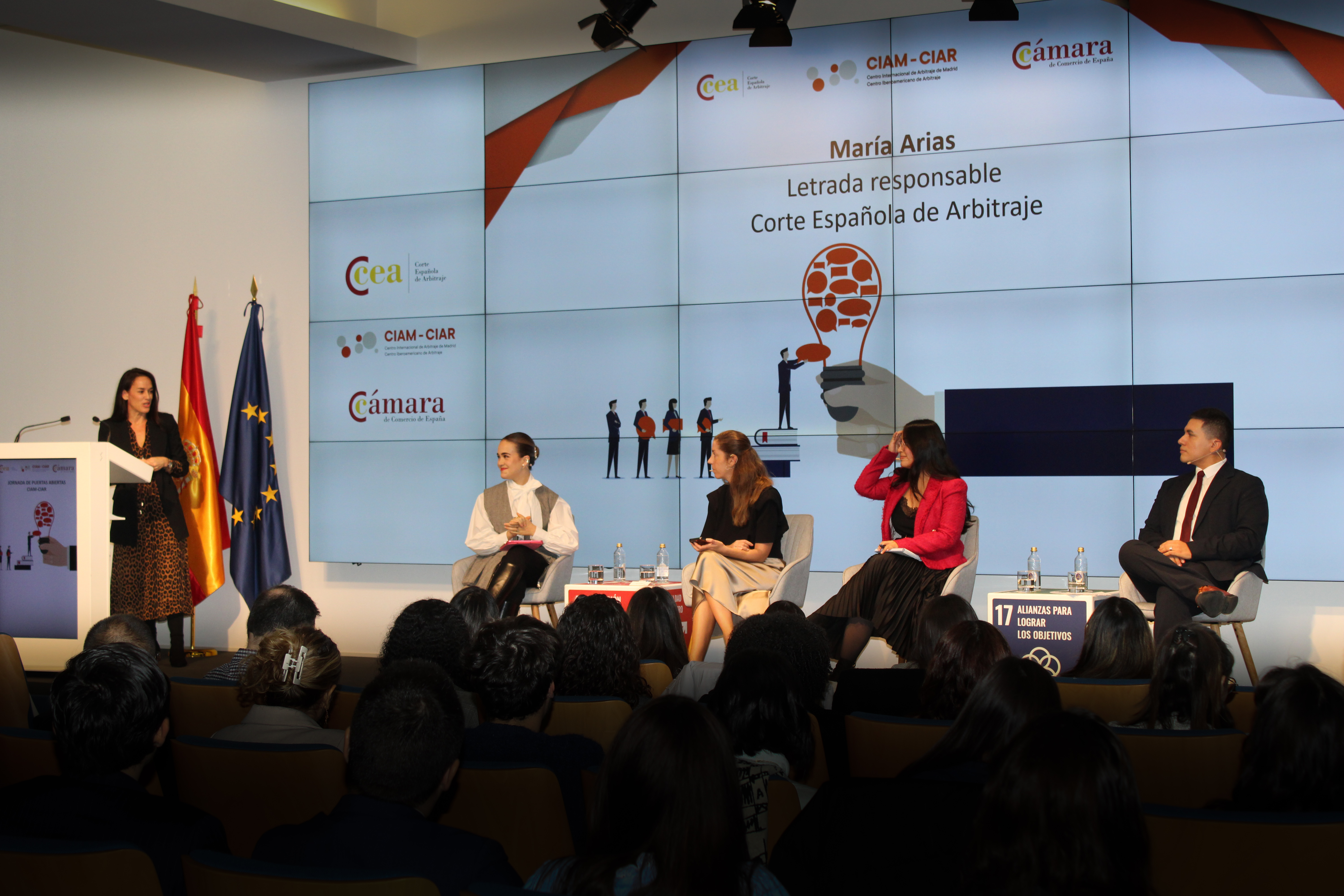 18 Nov 2025 La Cámara de Comercio de España ha acogido una jornada de puertas abiertas del Centro Internacional de Arbitraje de Madrid – Centro Iberoamericano de Arbitraje (CIAM-CIAR) para estudiantes universitarios. Esta actividad forma parte de nuestro compromiso con toda iniciativa que tenga por objeto contribuir a la formación de los futuros profesionales y fortalecer el sistema arbitral desde la base.La sesión ha sido inaugurada por María Arias, letrada responsable de la Corte Española de Arbitraje (CEA), institución fundadora de CIAM-CIAR, que ha dado la bienvenida a más de 60 alumnos procedentes de distintos centros educativos, como la Universidad Carlos III de Madrid, la Universidad CEU San Pablo, ICADE, IE University y la Universidad Complutense de Madrid. Durante su intervención, ha explicado cómo nació CIAM-CIAR, fruto de la unificación de la actividad internacional de las Cortes fundadoras; su marcada vocación iberoamericana, materializada con la incorporación de CAM Santiago y cómo a través de CIAM-CIAR se contribuye a posicionar a España, y en concreto a Madrid, como sede de arbitrajes internacionales. Tras la bienvenida, se ha dado la palabra a los cuatro representantes del Centro: Michelle Vasco, directora de Desarrollo de Negocio; Elisa Vicente, directora jurídica, y Thalía Jiménez y Stefano Lobatón, letrados del CIAM-CIAR. Los cuatro han explicado a los estudiantes los conceptos básicos de arbitraje internacional, y el papel que desempeña la institución al velar por la correcta aplicación e interpretación del reglamento y por el buen desarrollo del procedimiento.Durante la charla, se ha hecho una introducción de la estructura orgánica de CIAM-CIAR y de las principales comisiones del Centro: la Comisión de Designación de Árbitros, la Comisión de Examen Previo de Laudos, la Comisión de Buenas Prácticas, y la Comisión de Recusación. Asimismo, se ha detallado la actividad de los Grupos de Trabajo, integrados por expertos que analizan los retos del arbitraje en los distintos sectores de actividad, y se ha repasado la oferta formativa que ofrece CIAM-CIAR (cursos de práctica avanzada para árbitros, seminarios, jornadas y webinars, entre otros). Tras un breve repaso por las distintas funciones de la institución, se ha dado paso a una parte más práctica, en la que los letrados han explicado a los estudiantes, paso a paso, qué ocurre cuando llega una solicitud de arbitraje, desde la admisión del caso y el cálculo de la provisión de fondos, hasta la designación de árbitros, la emisión de la primera orden procesal y calendario de actuaciones y la revisión del laudo. La jornada ha finalizado con una enriquecedora ronda de preguntas por parte de los alumnos, a través de las cuales ha compartido sus dudas e inquietudes y han podido profundizar un poco más sobre cuestiones particulares.
